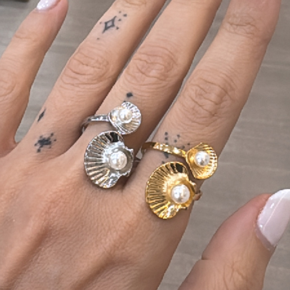 Ατσάλινο δαχτυλίδι με διπλό κοχύλι και  πέρλα σε χρυσή και ασημένια απόχρωση.