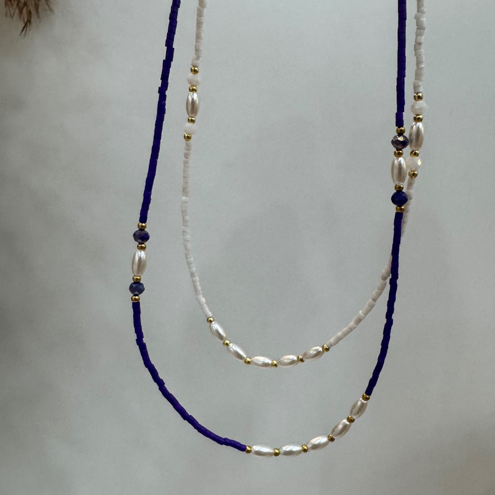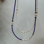 Ατσάλινο κολιέ με μπλε ή λευκές ματ χάντρες και γυαλιστερές πέρλες.