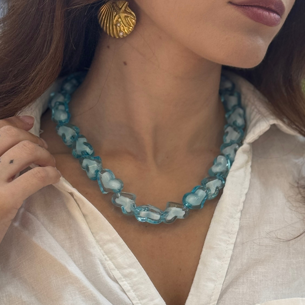 Ατσάλινο κολιέ με γυάλινες χάντρες σε aqua απόχρωση.